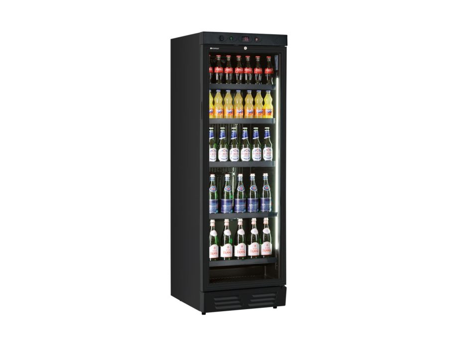 Hladnjak-izlog EKG 390 VG BLACK dizajniran je za maksimalnu vidljivost vaših proizvoda. Opremljen je s dvostrukim vertikalnim LED osvjetljenjem 105 cm duljine, koja ravnomjerno osvjetljava cijeli 5 podesivih polica. Staklena vrata s tehnologijom Protumagla / E Sprječavaju kondenzaciju i osiguravaju kristalno čist pogled na sadržaj, a istovremeno poboljšavaju izolaciju. Ugrađeni sustav osigurava preciznu kontrolu temperature (0° do 10°C). digitalni termometar. Budući da je sigurnost od najveće važnosti u ugostiteljskoj industriji, hladnjak je opremljen sustavom za automatsko zatvaranje vrata i mehanizam zaključavanja. Robustan dizajn obuhvaća kombinaciju dviju nogu i dviju kotačića, osiguravajući stabilnost i istovremeno omogućujući jednostavno premještanje jedinice tijekom čišćenja prostorije. Upotreba ekološki prihvatljivog rashladnog sredstva R290 Osigurava visoku učinkovitost i usklađenost s modernim ekološkim standardima. Unutrašnjost je prostrana i fleksibilna, jer pet čvrstih polica (493 x 360 mm) omogućuju prilagodljivu rasporedbu prema veličini ambalaže, od limenki do visokih boca.