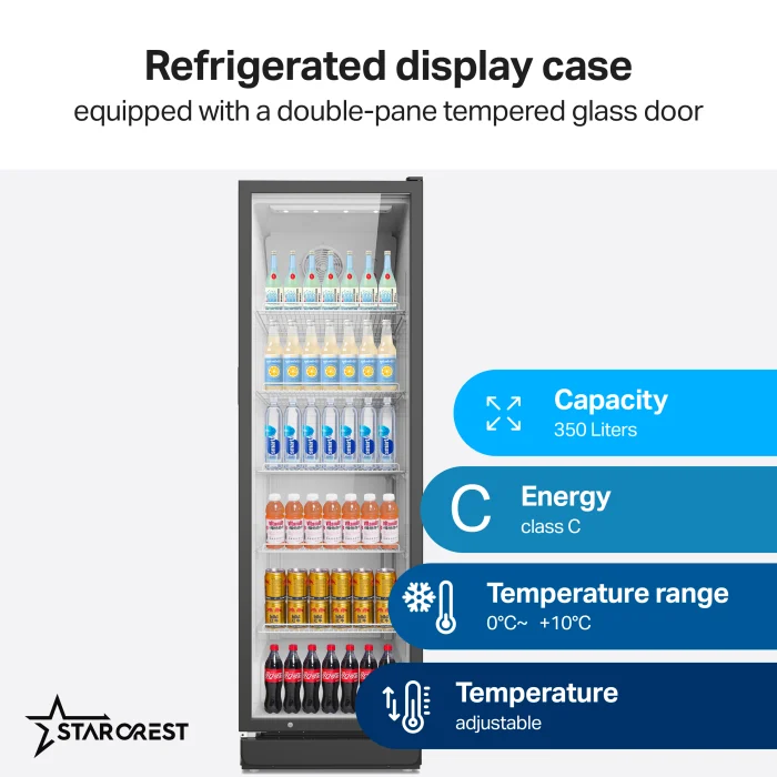 Profesionalna hladilna vitrina Starcrest SPS-350 s kapacitetom od 350 litara je idealno rješenje za trgovine, restorane i barove kojima je potrebno pouzdano hlađenje pića. Napredna Bez mraza Tehnologija dinamičkog hlađenja osigurava stalnu cirkulaciju hladnog zraka, što sprječava nakupljanje leda unutra i kondenzaciju na staklenim vratima. Izuzetna ušteda i učinkovitost vitrinu svrstavaju u energetski razred C. Vaši proizvodi će uvijek ostati kristalno vidljivi, a održavanje će biti jednostavno i bez zamornog odmrzavanja.