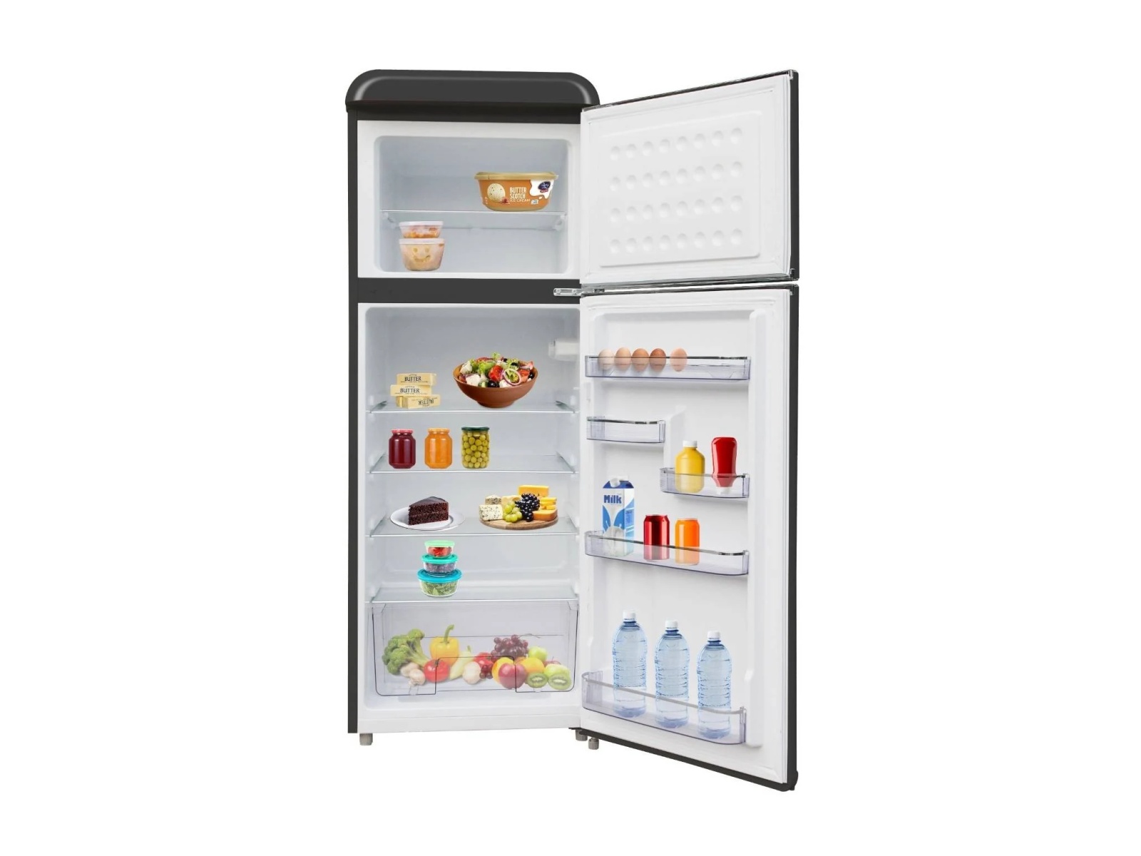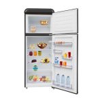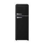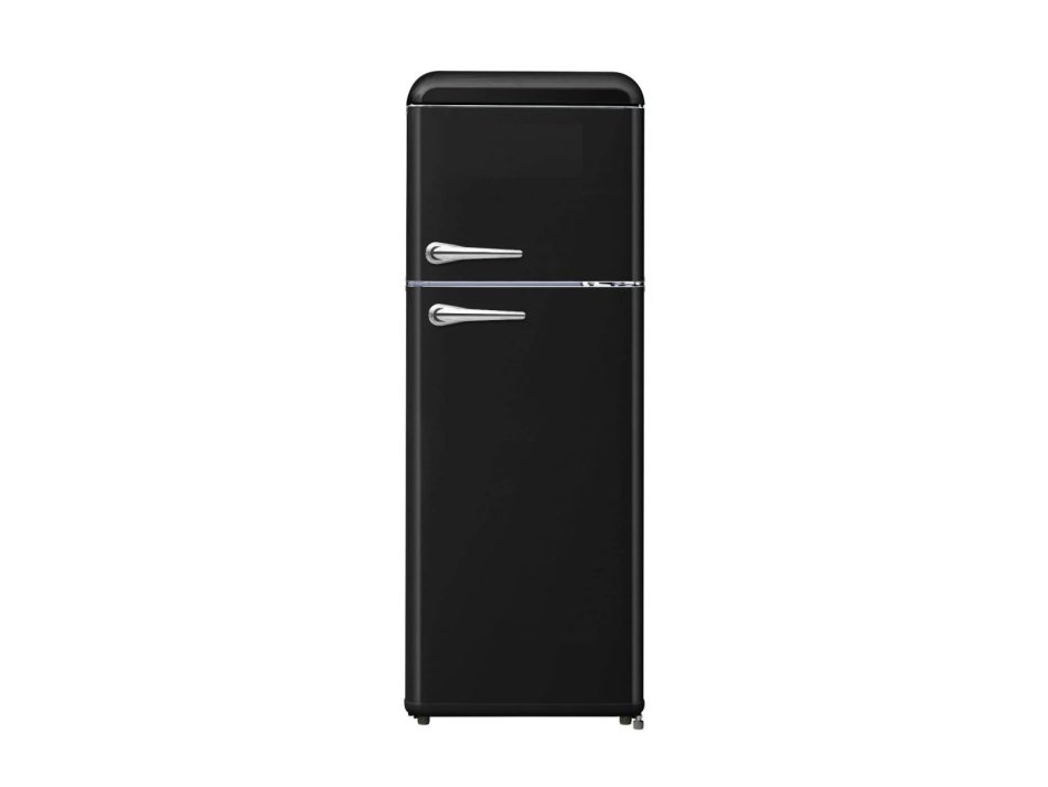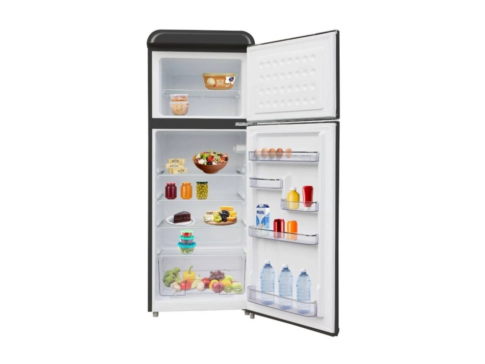 Starcrest SRF-208BK je elegantan retro hladnjak s dvoja vrata, ukupne zapremine 208 litara (hladilni dio 160 l, zamrzivački dio 48 l), LED osvjetljenje + podesivi termostat, dimenzije (V × Š × D) 147 × 54,5 × 58,5 cm.