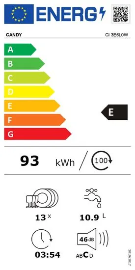 Candy CI3E7L0W1 je praktičen in zanesljiv vgradni pomivalni stroj, zasnovan za vsakodnevno uporabo v sodobnih gospodinjstvih. S kapaciteto 13 pogrinjkov omogoča učinkovito pomivanje večje količine posode naenkrat, kar je idealno za družine in srednje velika gospodinjstva. Pomivalni stroj spada v energijski razred E, kar zagotavlja uravnoteženo porabo energije in vode. Opremljen je s 5 programi pomivanja, med katerimi so varčni Eco program, intenzivni program za močno umazano posodo ter hitri program za vsakodnevno uporabo. Funkcija Smart Door samodejno odpre vrata ob koncu programa, kar izboljša sušenje in zmanjša porabo energije. Notranjost je prilagodljiva z nastavljivo zgornjo košaro, kar omogoča lažje pomivanje večjih loncev in ponv. Elektronsko upravljanje z jasnim prikazom zagotavlja enostavno izbiro programov, funkcija zamik vklopa pa omogoča prilagoditev delovanja vašemu urniku. Candy CI3E7L0W1 združuje funkcionalnost, preprosto uporabo in zanesljive rezultate pomivanja.