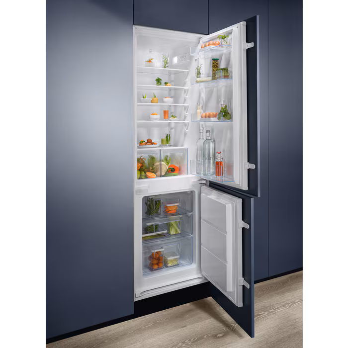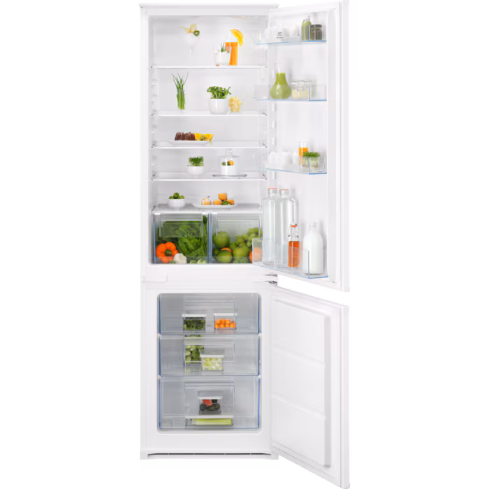 Electrolux LNS5LE18S je prostoren vgradni hladilnik z zamrzovalnikom iz serije 500, ki združuje zanesljivo delovanje, napredno tehnologijo in enostavno vzdrževanje. S skupno prostornino 271 litrov (hladilni del ~198 l, zamrzovalni del ~73 l) je odlična izbira za srednje velika gospodinjstva.